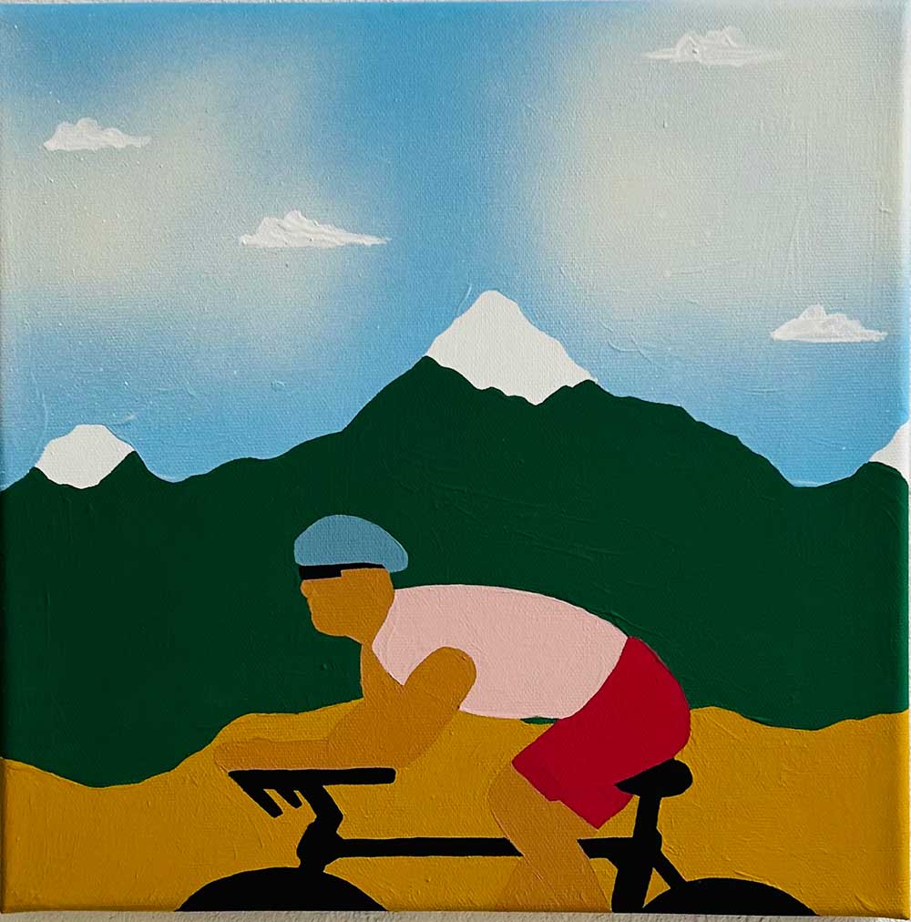 ”Cyklist” är ett verk av Oskar Palmbäck gjort år 2026. Tekniken är akryl och vinyl på duk i ett unikt exemplar. Verket mäter 30 x 30 cm. Signerat av konstnären.