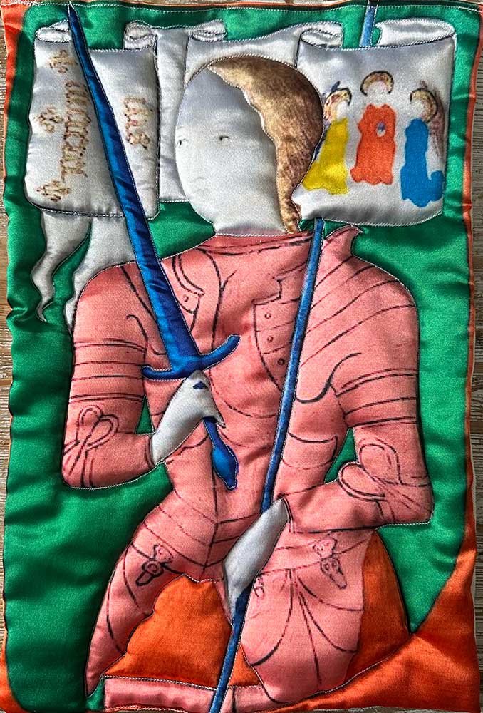 ”Jeanne d’Arc” är ett konstverk av Moa-Matilda Nilsson. Det är digitaltryck på polyester, med quiltning och broderi gjort 2025 i ett unikt exemplar och mäter 40 x 25 cm.