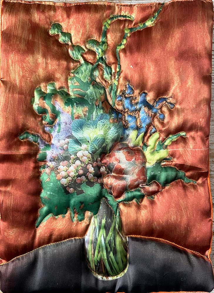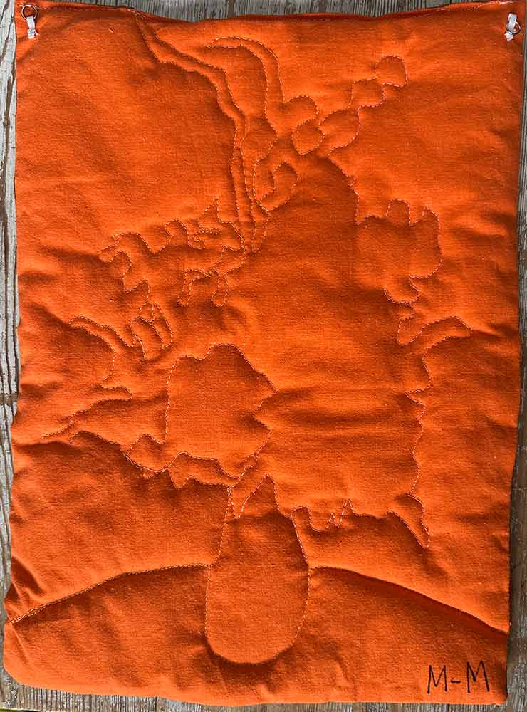 ”Mörkorange blomma” är ett konstverk av Moa-Matilda Nilsson. Det är digitaltryck på polyester, med quiltning och broderi gjort 2025 i ett unikt exemplar och mäter 35 x 25 cm.