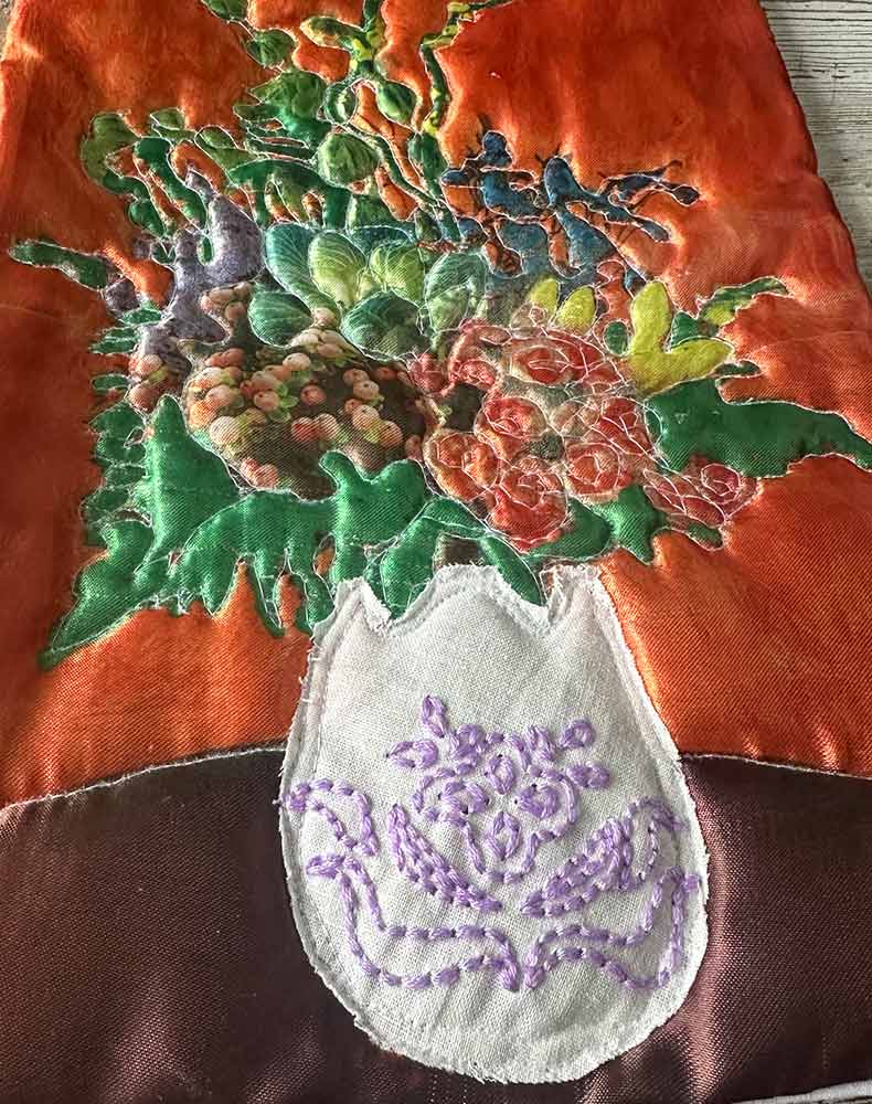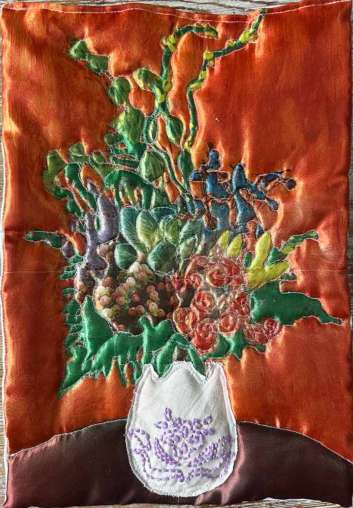 ”Orange blomma med broderi” är ett konstverk av Moa-Matilda Nilsson. Det är digitaltryck på polyester, med quiltning och broderi gjort 2025 i ett unikt exemplar och mäter 33 x 22 cm.