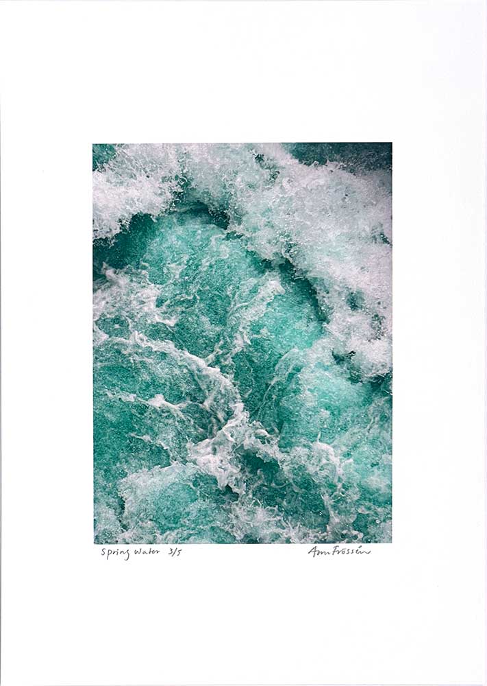 ”Spring water” är ett verk av Ann Frössén gjort år 2025. Tekniken är fotocollage, digitalt pigmenttryck på papper och finns i en upplaga av 5. Verket mäter 30 x 20 cm, tryckytan är 17 x 13 cm. Signerat och numrerat av konstnären.